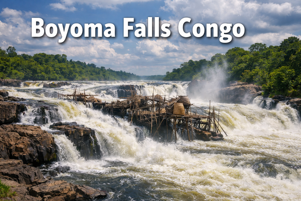 Boyoma Falls is a 100-kilometer series of seven cataracts on the Lualaba River in northeastern DRC with a total drop of 61 meters. The falls system carries more water volume annually than Niagara or Iguazu Falls. Access is via Kisangani, reachable by air from Kinshasa or Goma. The Wagenia people practice traditional fishing using wooden structures in the rapids. Best travel period is June to September during the dry season. French and Swahili are the primary languages spoken in the region.