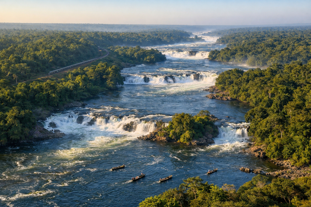 Boyoma Falls Congo is a 100-kilometer waterfall system on the Lualaba River in Tshopo Province, DRC, featuring seven distinct cataracts with a combined elevation drop of 61 meters. The falls mark the geographic point where the Lualaba River transitions into the Congo River, Africa’s second-longest river. Visitors access the falls through Kisangani, the nearest major city, during the dry season months of June through September when river levels are lower and travel conditions are more predictable.