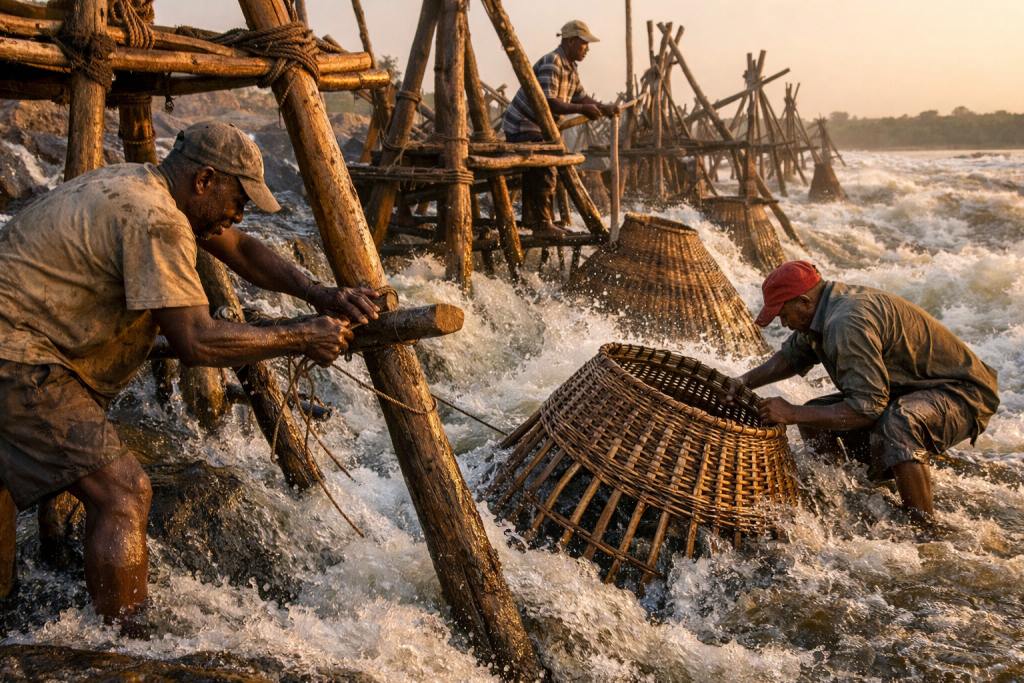 Fishermen construct large wooden tripods that extend into the rushing water. Conical woven baskets are suspended from these tripods, positioned to catch fish as they attempt to navigate upstream through the rapids. The design allows only mature fish to enter the baskets, functioning as a selective fishing method.
