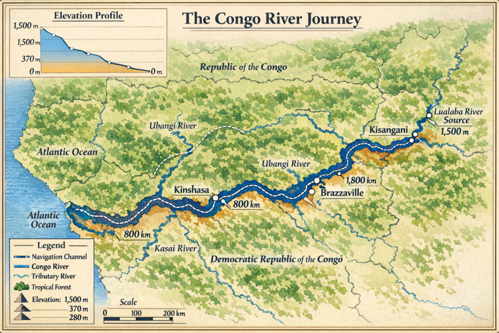 • Congo River stretches 4,700 kilometers from Lualaba headwaters to Atlantic Ocean through two countries