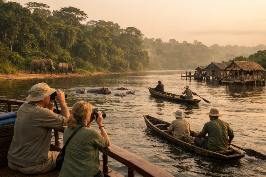 • River safaris and boat tours provide access to Congo Basin rainforest parks and wildlife areas