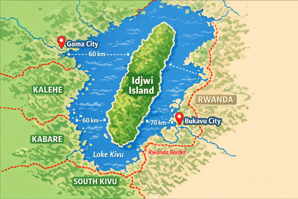 Idjwi Island Dr Congo is the largest island in the Democratic Republic of Congo by surface area and population density, located in Lake Kivu approximately 70 kilometers from Bukavu City and 60 kilometers from Goma City. The island came under M23 rebel control in early 2026 without military resistance as part of broader territorial advances across eastern DRC. Travel to Idjwi Island is currently not recommended for tourists due to active conflict, military control by non-state armed groups, and the presence of approximately 42,800 displaced persons living in precarious conditions on the island.