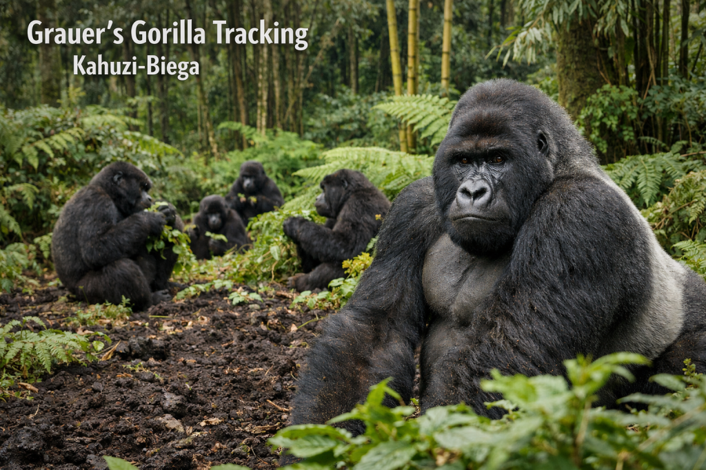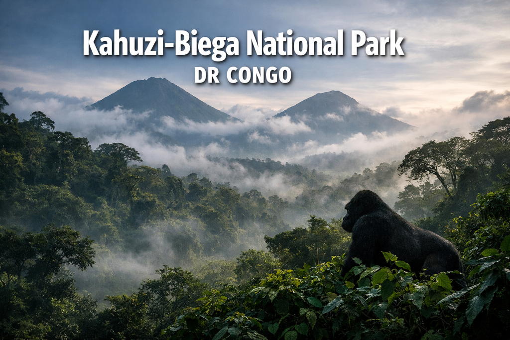 Kahuzi-Biega National Park Dr Congo is a 600,000-hectare UNESCO World Heritage Site in eastern Democratic Republic of Congo, protecting the world’s largest remaining population of Critically Endangered Grauer’s gorillas. The park extends across primary montane rainforest dominated by two extinct volcanoes, Mount Kahuzi at 3,308 meters and Mount Biega at 2,790 meters, located west of Bukavu in South Kivu province. Visitors travel to Kahuzi-Biega National Park primarily for gorilla trekking safaris focused on habituated Grauer’s gorilla families, with access managed through the Institut Congolais pour la Conservation de la Nature (ICCN) and international conservation partners including the Wildlife Conservation Society.