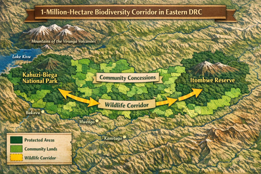 A 1-million-hectare biodiversity corridor connecting Kahuzi-Biega to Itombwe Reserve is more than halfway complete with 23 community forest concessions covering 600,000 hectares secured by December 2025.