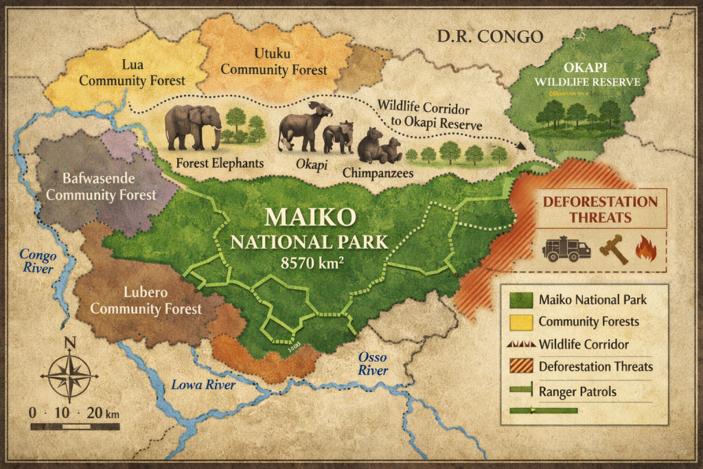 Maiko National Park sits in the central Congo Basin rainforest, straddling three provinces in eastern DRC. The park boundaries extend across Maniema, North Kivu, and South Kivu, positioned between the more accessible Virunga National Park to the east and Okapi Wildlife Reserve to the north.