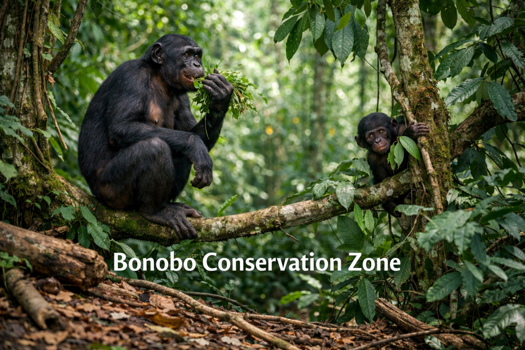 Salonga National Park Dr Congo protects the largest population of bonobos remaining in the wild. Bonobos exist only in the Democratic Republic of Congo and nowhere else on Earth. The park’s isolation provides critical habitat for these endangered primates.