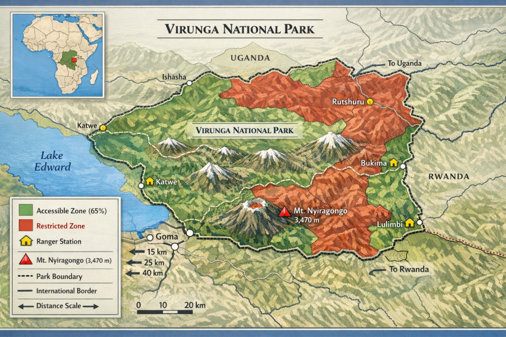 Virunga National Park DR Congo operates as a managed conservation area with limited tourist access in 2026, following recovery of 65% of park territory by authorities.